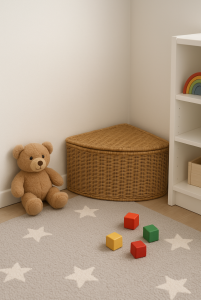 - Детская зона. Большая корзина-лукошко для игрушек, которые нужно быстро убрать при приходе гостей.